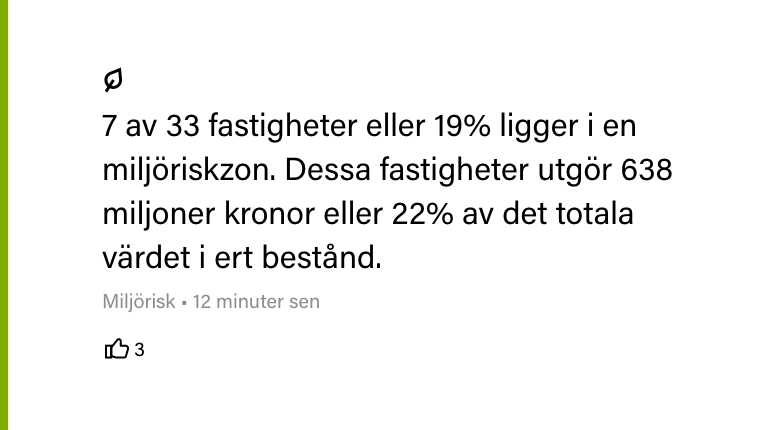 Världen förändras och vi behöver följa med. Förutsättningarna för lyckade investeringar är bundet till våra klimat- och miljöförutsättningar. Under Q2 rullar vi ut screening för klimatrisk i enlighet med EU taxonomin med möjlighet att exportera miljörapport på ert bestånd.